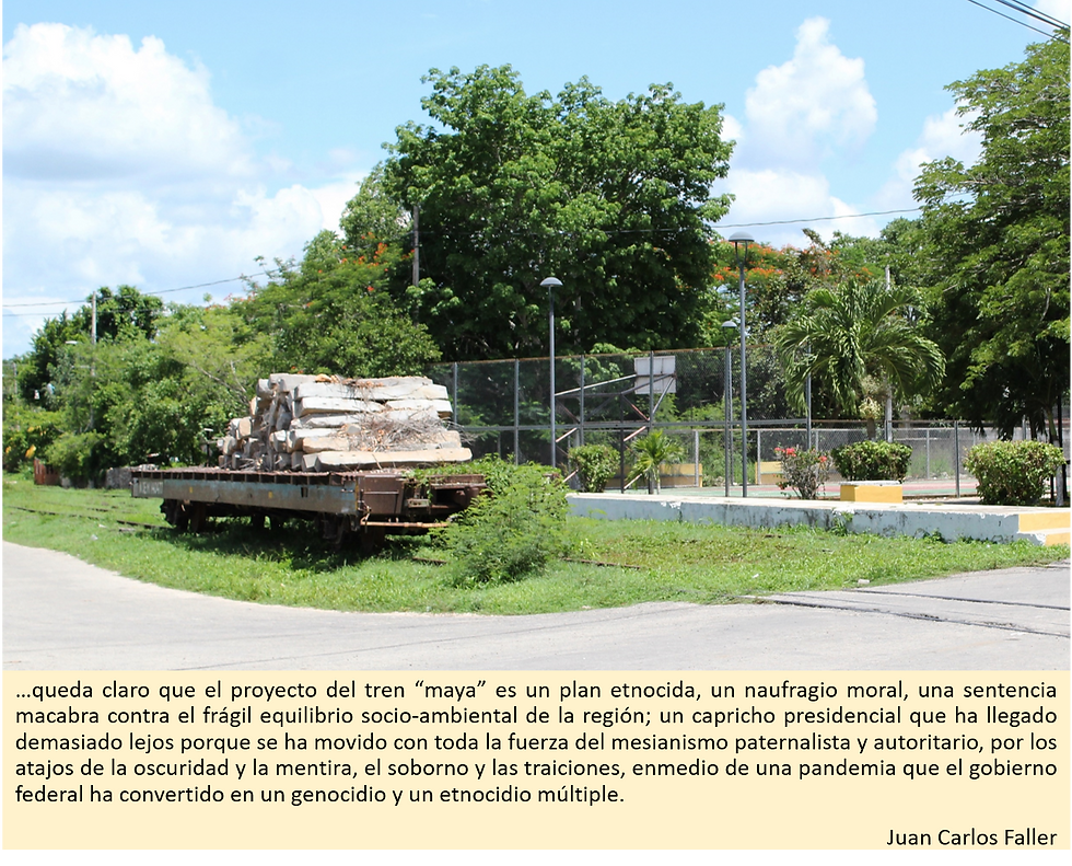 Por todo esto y por el Convenio 169 de la OIT y la Declaración de las Naciones Unidas sobre los Derechos de los Pueblos Indígenas, queda claro que el proyecto del tren “maya” es un plan etnocida, un naufragio moral, una sentencia macabra contra el frágil equilibrio socio-ambiental de la región; un capricho presidencial que ha llegado demasiado lejos porque se ha movido con toda la fuerza del mesianismo paternalista y autoritario, por los atajos de la oscuridad y la mentira, el soborno y las traiciones, enmedio de una pandemia que el gobierno federal ha convertido en un genocidio y un etnocidio múltiple.