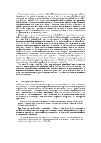 Enuna reunión celebrada en marzo de 2019 en Ebtún, mientraslos representantes del gobierno discutían con los vecinos las razones por las que se detuvo el proyecto, el gobierno siguió enfatizando que los firmantes de la demandaeran miembros de otras 'comunidades no afectadas', como Dzitnup y Valladolid. Sin embargo, para los miembros de la comunidad maya signatarios de la demanda, así como para muchas otras bases y defensores del territorio maya, el hecho de que el proyecto no esté 'en su patio trasero' o dentro del límite oficial de su localidad, no significa que no les afectará. Para ellos, es clave reivindicar la defensa de un 'territorio' en un sentido más amplio de la palabra: 'El territorio es ese lugar de donde vienen nuestros antepasados, donde realizamos nuestras actividades de la vida diaria, no necesariamente donde laley lo limita' (Ian, residente maya local). El punto aquí es que la decisión de quién se verá afectado (o no) no debe dejarse en manos de los formuladores de políticas y los desarrolladores. El hecho de que las comunidades localesno puedan decir si serán afectadas o no por un proyecto ya constituye una violación de su derecho colectivo indígena a la autodeterminación. Y, por tanto, constituye una injusticia. Los miembros de base y de la comunidad que se oponen a las ideas a estos proyectos no lo hacen pensando como una preocupación individual. Se conciben a sí mismos como una comunidad completa, y como tal, si algunos de ellos o sus tierras se ven afectados, todos se ven afectados, independientemente de que el proyecto no esté literalmente en su casa. Estas injusticias colectivas casi nunca se mencionan en el marco de la justicia energética, ya que su base teórica está fuertemente centrada en los marcos individualistas del Noroeste Global, más notablemente del filósofomoral John Rawls (Galvin, 2020). En palabrasde Schlosberg y Carruthers (2010,p. 17), “a diferencia del pensamiento político liberal tradicional, los movimientos contemporáneos no se limitana entender una injusticia como enfrentada solo por individuos; el reclamo de justicia como comunidad suele estar en el primerplano de sus interesesy protestas”. Si el marco de justicia energética aspira a tener un impacto más allá del Norte, es clave que reconozca las concepciones más amplias de justicia. También debe prestar más atención a las visiones de las movilizaciones colectivas, como las que reclaman que se respete su derecho a la libre autodeterminación para que el pueblo sea quien decida quién está siendo afectado, a quién debe consultarse y bajo qué concepciones de justicia una transición a energías renovables debe llevarsea cabo. 4.1.2. Participación no significativa Además del proceso contencioso de inclusión parcial de las comunidades en la toma de decisiones clave, otra injusticia procesal significativa percibida y vivida en el campo es el tipo de participación de los pueblos en la implementación del proyecto. Dentro del actual modelo privado a gran escala parala transición energética, la participación de las personas para decidir sobre el proyecto a menudo se limita a una decisión de sí o no en la llamada CLPI. Para muchos miembros de la comunidad, ser consultados una vez que se han tomado todas las decisiones clave en términos de ubicación, tamaño del proyecto, tipo de tecnología y áreas de influencia del proyecto no equivale a una participación significativa. Ellos [los desarrolladores] llegan con el proyecto y ya está todo hecho, el personal que viene ya sabe cuáles son los tratos. . . el gobierno ya está incluido también, entonces, ¿qué espera de una empresa?, viene a poner su negocio (Marcelino, residente local Ebtún) Esta forma de participación comunitaria es vista por miembros de la comunidad y movimientos de base como una fachada, un intento de legitimar la imposición de un proyecto mientras se pretende que las comunidades puedan ejercer su derecho a la autodeterminación y al consentimiento informado. Las consultas se hacen cuando los proyectos ya están definidos, cuando ya están hechos los contratos cuandotodo está claro entre ellos, luego se hace una simulación, la gente va y vota,y ya está. Eso no es una consulta; eso es engaño(Mario, vecino de Valladolid).